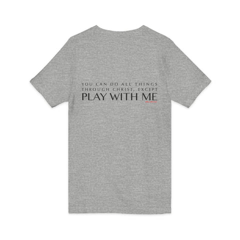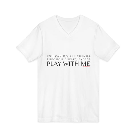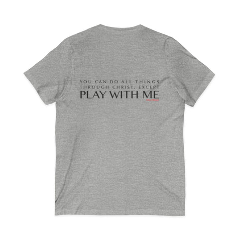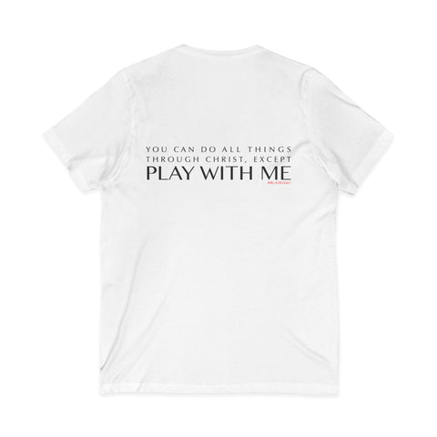 Introducing our stylish Unisex Jersey Short Sleeve V-Neck Tee! This comfortable tee combines a trendy design with a message that speaks to faith and playfulness, making it perfect for anyone looking to express their beliefs with a touch of fun. Crafted from lightweight 100% cotton, it offers a smooth feel against the skin, ideal for all-day wear. The relaxed fit and V-neckline ensure a flattering silhouette, making it versatile enough for both casual outings and semi-formal gatherings. It's an excellent gift for friends and family, especially during holidays like Easter, church events, or any occasion where you want to inspire positivity. Wear it to casual meet-ups or relaxed family gatherings and let your message shine!